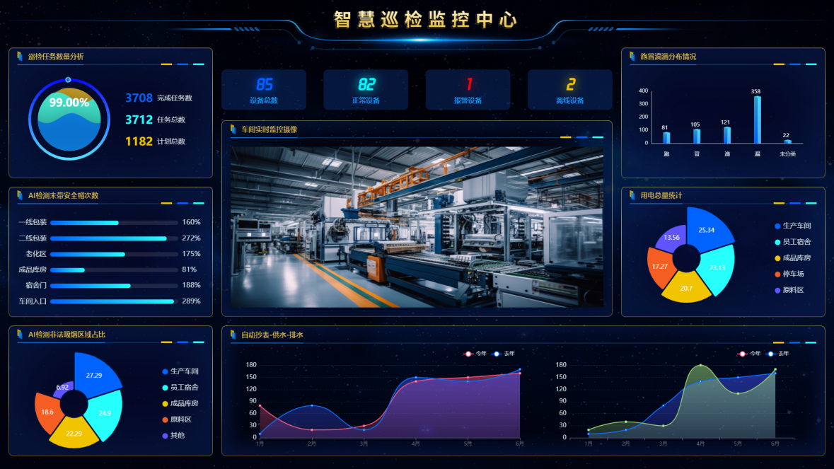 智慧巡检大屏用于集中展示智慧巡检各个主题的统计与分析,数据实时刷新,形式生动多样,实时巡检大屏除了看到常规的巡检统计分析图表,也支持对摄像头的实时展示。